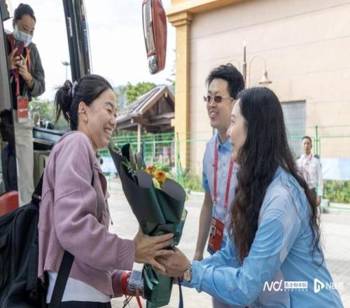 今日上午9時許,來自浙江的運動員代表團率先抵達,成為運動員酒店第一支入住隊伍。十五運會網球競委會新聞廣電宣傳處、行政接待處副處長張文驥聯同競委會一眾代表以及可愛的十五運會吉祥物“喜洋洋”“樂融融”,在運動員酒店外喜迎代表隊并獻上鮮花,以東道主的熱情歡迎運動健兒們的到來。
