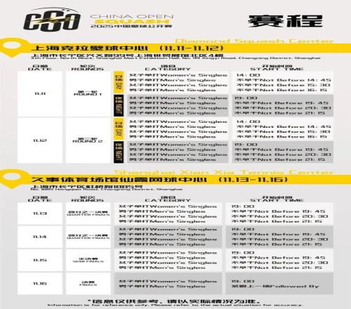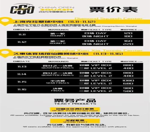 本屆比賽的賽程延長至6天,首次采用“雙主場”模式。11月11日至12日的前兩輪比賽將在上海克拉壁球中心展開,11月13日的四分之一比賽開始,賽事將來到久負盛名的久事體育場館仙霞網球中心,以不同場館的展示特性,來打造多層次、全景式觀賽體驗。賽事票務銷售已于10月17日中午12時正式啟動。